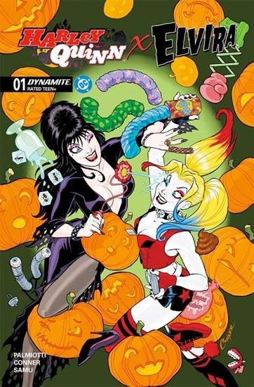 THE MISTRESS OF THE DARK MEETS DADDY’S LITTLE MONSTER! What happens when the Clown Princess of Crime gets bored? Shenanigans, hijinks, grievous bodily harm… the possibilities are endless! Now add in a certain macabre-minded TV host who seems to attract trouble like crypts attract vampires, and the stage is set for the greatest team-up since Frankenstein met his Bride! With her beloved show on the chopping block following a corporate takeover, Elvira needs to come up with a plan to get things back in the black ― and her new friend Harley Quinn has an idea that’s just crazy enough to work! Together, they’re going to throw the greatest Halloween party Brooklyn has ever seen ― whether the borough likes it or not! Written by AMANDA CONNER and JIMMY PALMIOTTI ― the world-famous tag-team of all things Harley Quinn ― this crossover event for the ages from Dynamite and DC Comics also showcases Amanda’s fan-favorite artistic chops, with each issue featuring two (count ’em, two) Conner covers. And that’s not all (certainly not!) ― she’s also joining interior artist (and Elvira favorite) JUAN SAMU to provide selected story pages for the series! But wait, there’s more! This premier issue also includes darkly captivating covers from JOSEPH MICHAEL LINSNER, CHAD HARDIN, BEN CALDWELL, and best-selling Mark Spears Monsters creator MARK SPEARS!