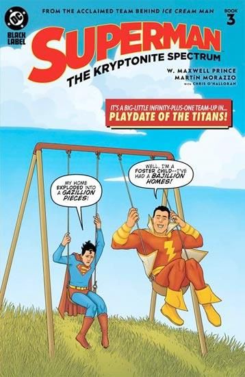 W. MAXWELL PRINCE AND MARTIN MORAZZO TAKE SUPERMAN TO EVEN WEIRDER HEIGHTS! Superboy and Captain Marvel ride the rickety roller coaster (literally!) through the many-hued amusement park of motley meteoroids that is the Kryptonite Spectrum! With Superman now a bit...shorter in the tooth...the Boy of Yesterday must team up with a truly Marvelous friend in a story for the ages...for all ages! What, exactly, is Nostalgia Springs? And what do Toyman and Sivana have to do with it? Find out in this great adventure--chock-full of crayons, Kryptonites, and a cruise through comics chronology!